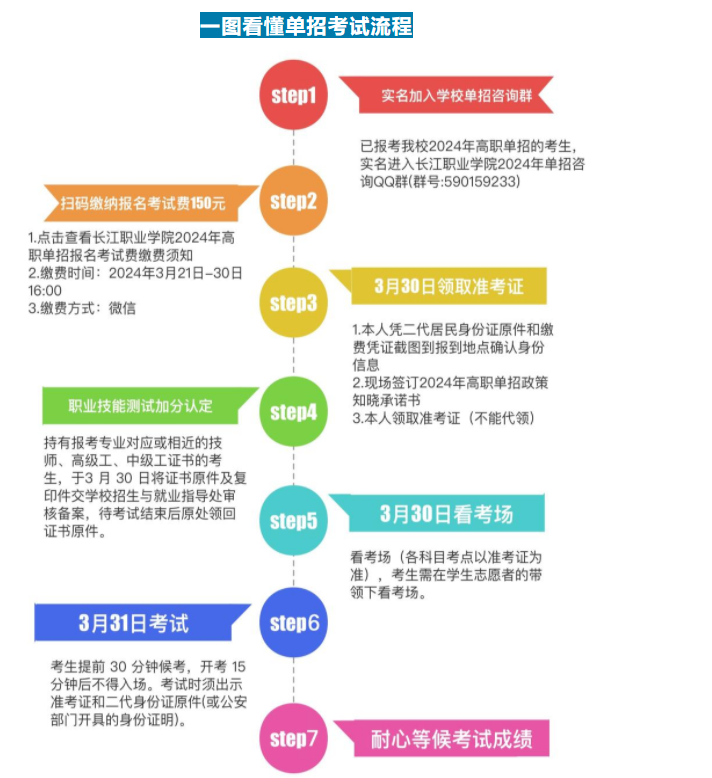 来了,来了,2024年长江职业学院高职单独招生考试提醒出来了!小编为大家都整理好啦,只需要动动手指收藏一下就可以随时查看啦。缴费时间是2024年3月21日14:00至2024年3月30日16:00,可不要记错啦。那都有哪些内容呢,和小编一起去看看吧。