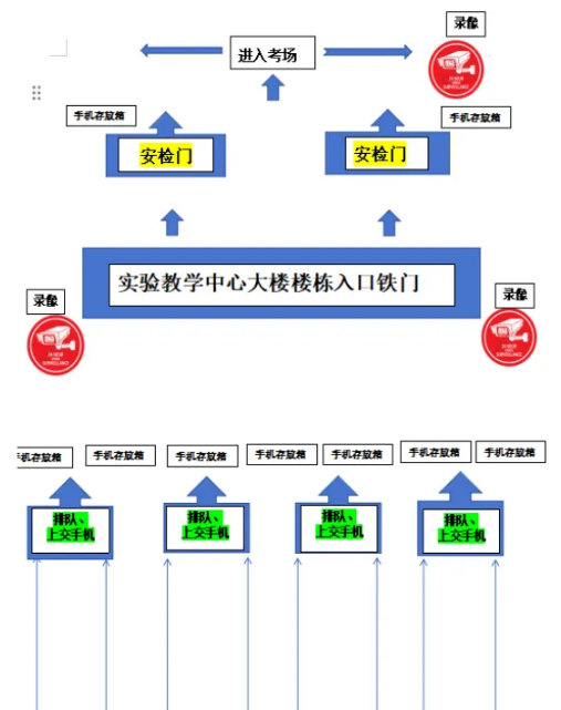 按照下图,武昌理工学院考生进入考场大门分三个关口:排队关口、收手机关口、安检门关口。
