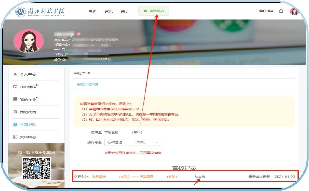 提交后,审核记录中可查看变更专业申请记录,并时刻关注审核状态