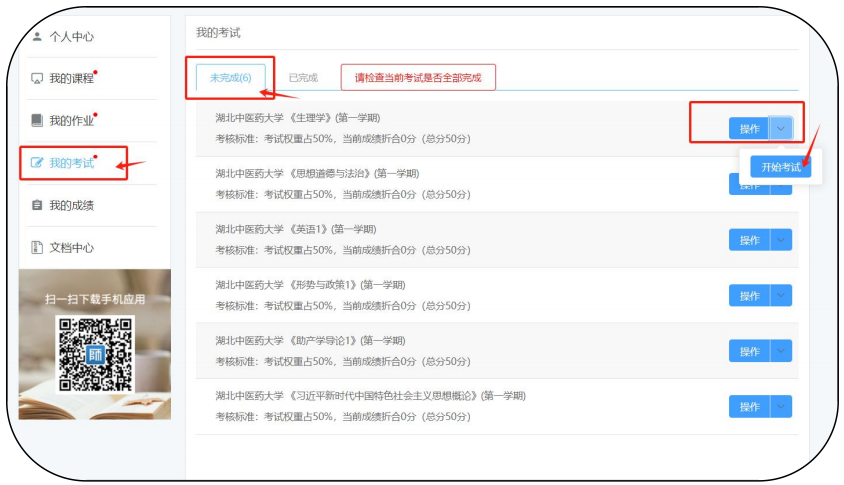 点“我的考试”→点操作→进入“开始考试”,考完点击交卷。