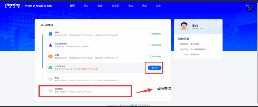 4.操作步骤:登录后点击“成绩查询”,即可查看本人考试成绩。
