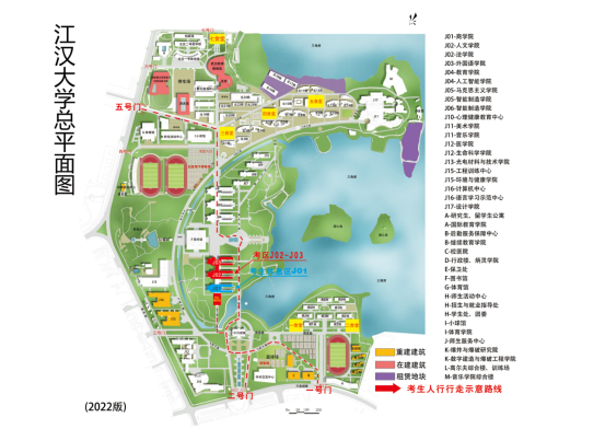 1.考生统一凭有效居民身份证和考试通知单,由江汉大学1号门、2号门或5号门进入校园。