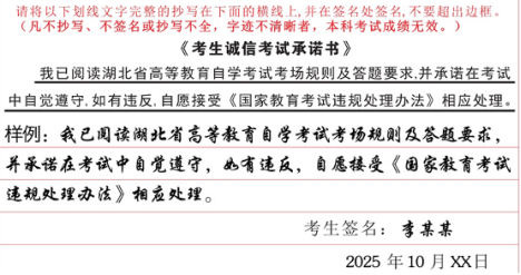 1.考生诚信考试承诺书。考生应主动配合课程笔迹信息采集,在答题卡指定区域按规定完整抄写《考生诚信考试承诺书》(抄写样例如下图),凡不抄写、不签名或抄写不全,字迹不清晰者,该科考试成绩无效。
