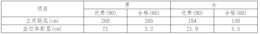 1.体育测试项目为坐位体前屈和立定跳远两项,执行《国家学生体质健康标准》(高三毕业生评价指标)(详见附件),因残疾或重疾等身体原因不能参加体育测试的考生,可凭相关证明免除体育测试,其余考生均需参加两项测试,体育测试成绩不作为录取排序依据,合格即可,但凡有一项测试不合格者即失去参加综合能力测试资格,因临时生病不能参加体育测试的考生,可凭二级甲等以上医院病历办理缓测手续,录取后在新生报到前先行参加测试并合格后方可办理新生报到手续。