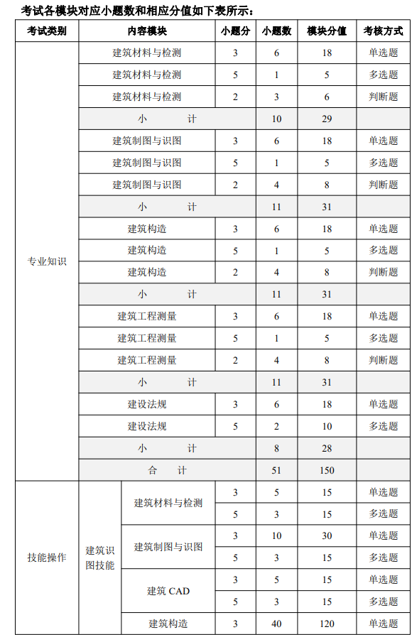 专业知识考试150分,采用单项选择题90分,多项选择题30分,判断题30分。技能操作考试340分,其中建筑识图技能考试240分,采用单选题180分,多选选择题60分;建筑测量技能考试100分,根据测量仪器使用的规范性、测量方法的正确性和测量数据的准确性评分。